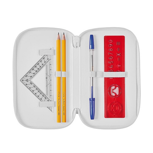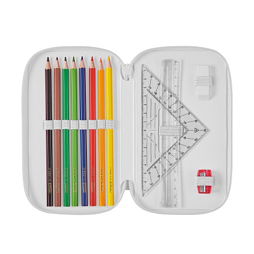 19,3 x 11,5 x 7 cm, 31 dílů - 14 fixů, 8 pastelek, 2 tužky, ořezávátko, guma, 16 cm pravítko, trojúhelník, úhloměr, pravítko - šablona, kuličkové pero, materiál: polyester
