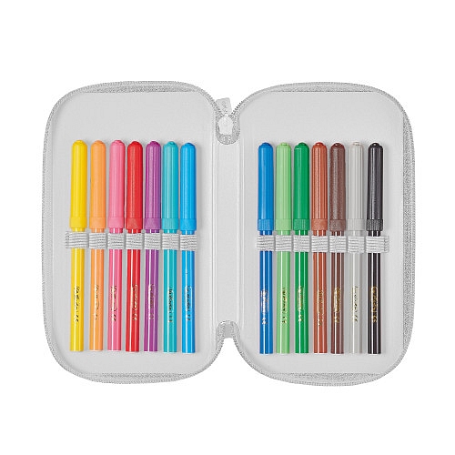 31 ks, materiál polyester, 3 přihrádky na zip (barevné), vnitřní materiál: barevný, výplň: 14 fix,8 šestihranných pastelek, 2 černé šestihranné …