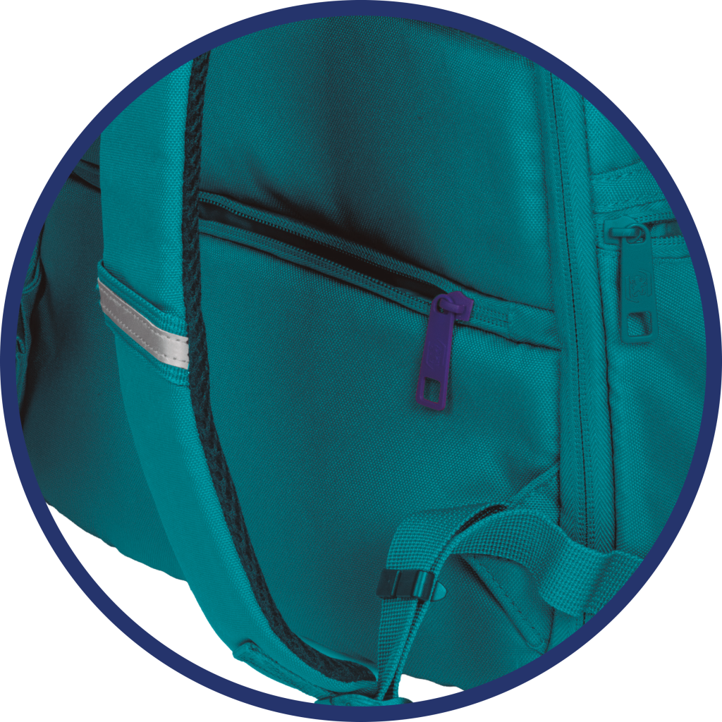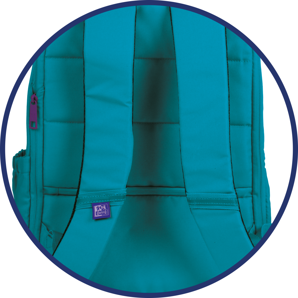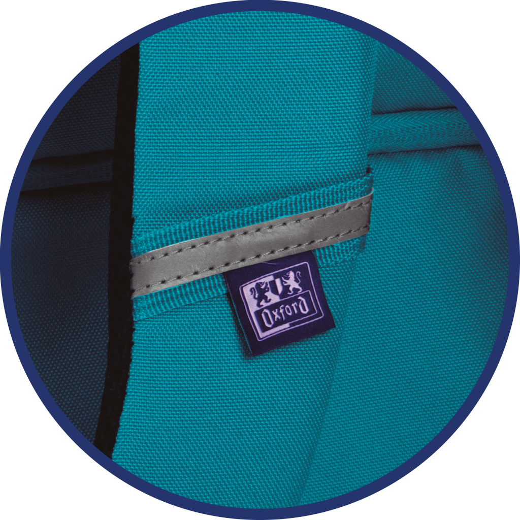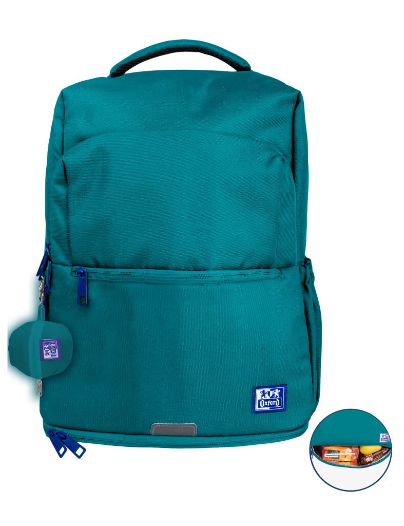Batoh Oxford 30 l, tyrkysový, rozměry 51 × 38 × 30 cm, prostorný a praktický batoh vhodný do školy, práce i na volný čas, speciální polstrovaná přihrádka na notebook pro bezpečné uložení počítače, spodní samostatná termo kapsa na svačinu pro udržení čerstvosti potravin, tajná kapsa v zadní části u zad pro bezpečné uložení cenností, přední skrytá kapsa pro rychlý přístup k drobnostem, boční kapsa s pružnou gumičkou na láhev, reflexní prvky vpředu i vzadu pro vyšší bezpečnost, nastavitelné ramenní popruhy se zapínacími klipy pro pohodlné nošení, součástí kulatá bambule s integrovanou pláštěnkou, která celý batoh zakryje a ochrání před deštěm.