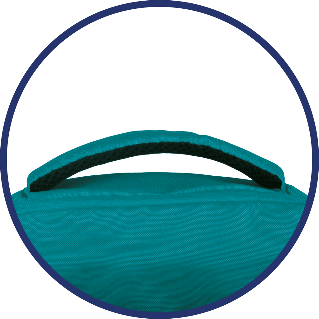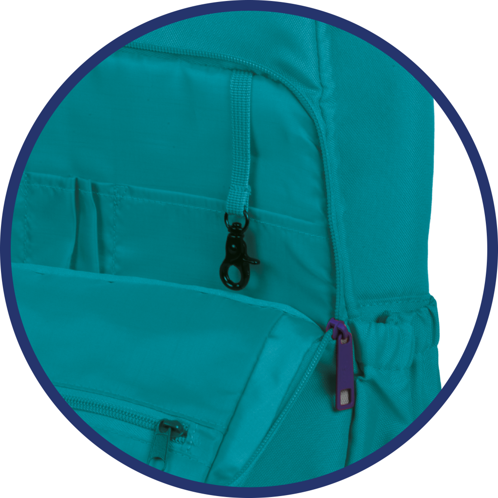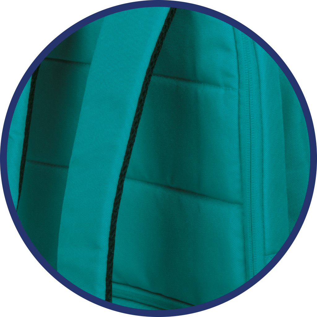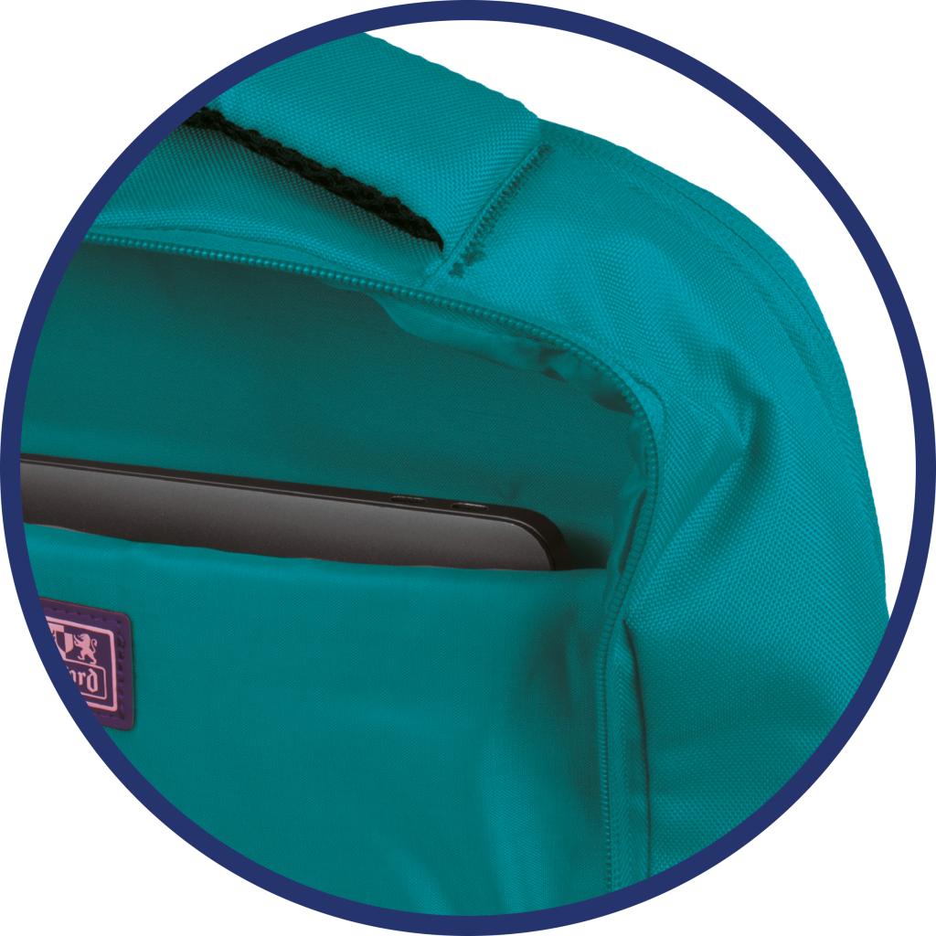 Batoh Oxford 30 l, tyrkysový, rozměry 51 × 38 × 30 cm, prostorný a praktický batoh vhodný do školy, práce i na volný čas, speciální polstrovaná přihrádka na notebook pro bezpečné uložení počítače, spodní samostatná termo kapsa na svačinu pro udržení čerstvosti potravin, tajná kapsa v zadní části u zad pro bezpečné uložení cenností, přední skrytá kapsa pro rychlý přístup k drobnostem, boční kapsa s pružnou gumičkou na láhev, reflexní prvky vpředu i vzadu pro vyšší bezpečnost, nastavitelné ramenní popruhy se zapínacími klipy pro pohodlné nošení, součástí kulatá bambule s integrovanou pláštěnkou, která celý batoh zakryje a ochrání před deštěm.
