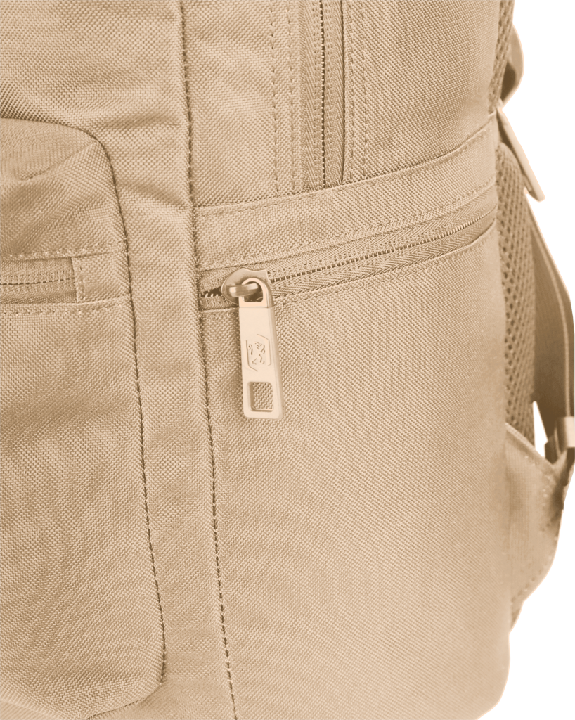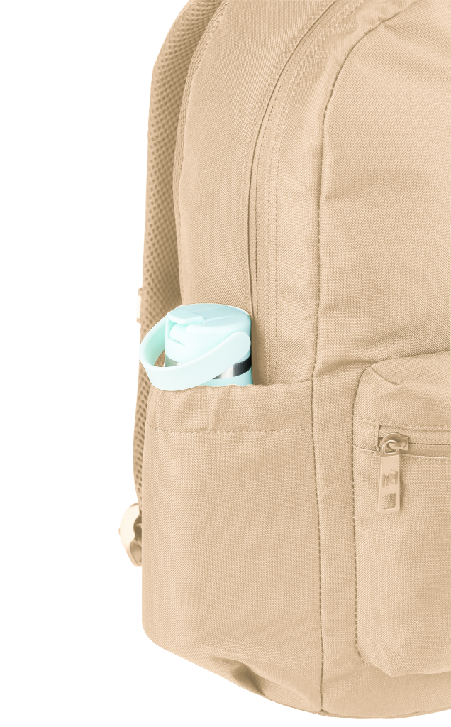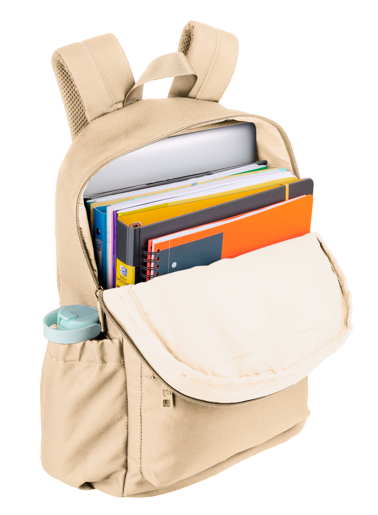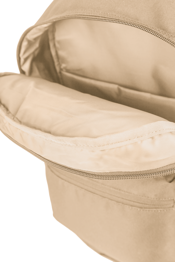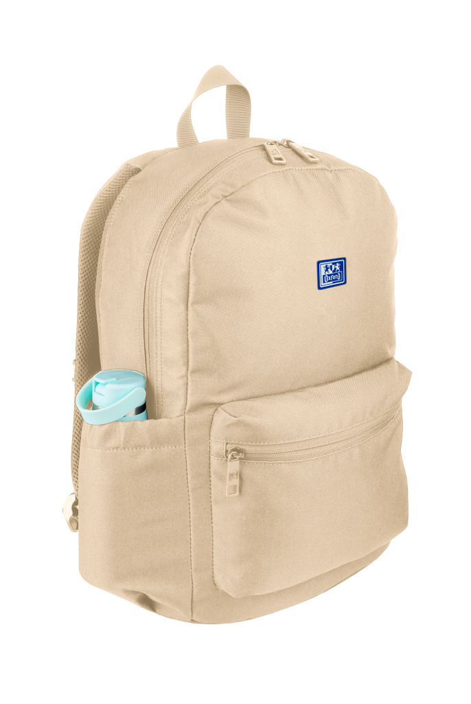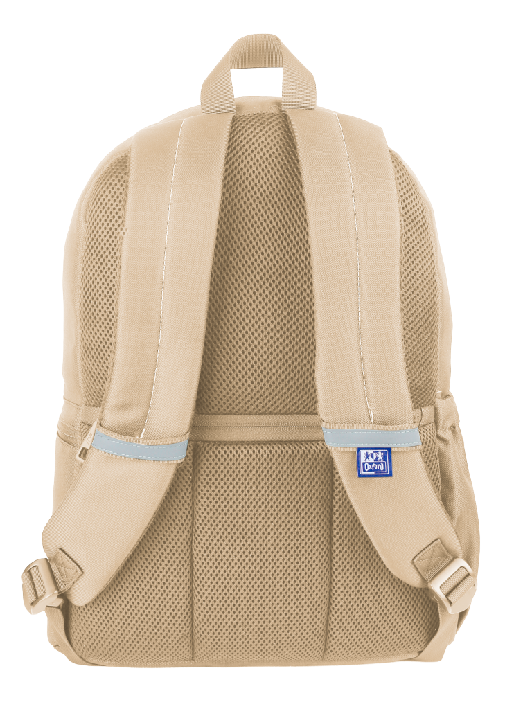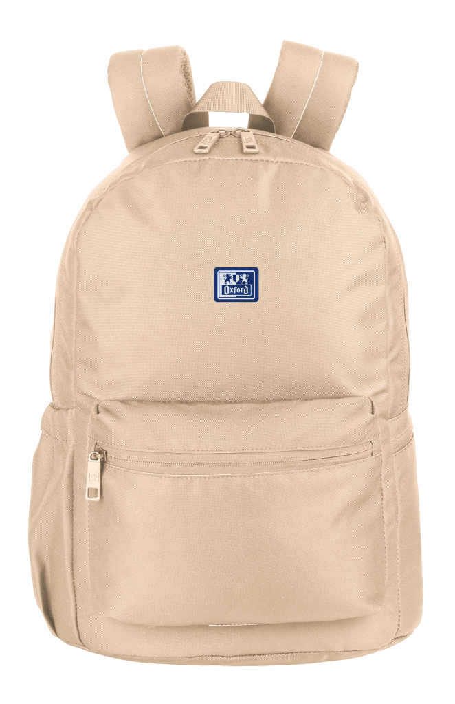 Batoh školní, Oxford béžový velká hlavní přihrádka a vyztužená kapsa na notebook, menší kapsa vpředu a dvě boční. Zpevněné dno batohu. Vyztužená, prošívaná záda, nastavitelné ramenní popruhy. Polyester, 42 x 29 x 17 cm, 18 l