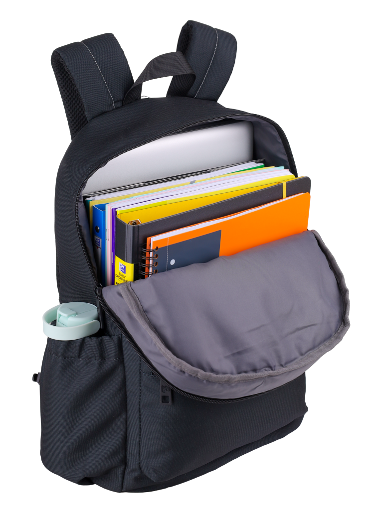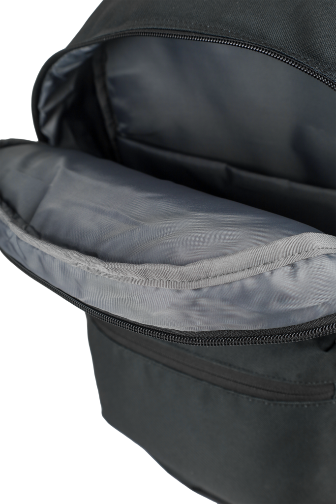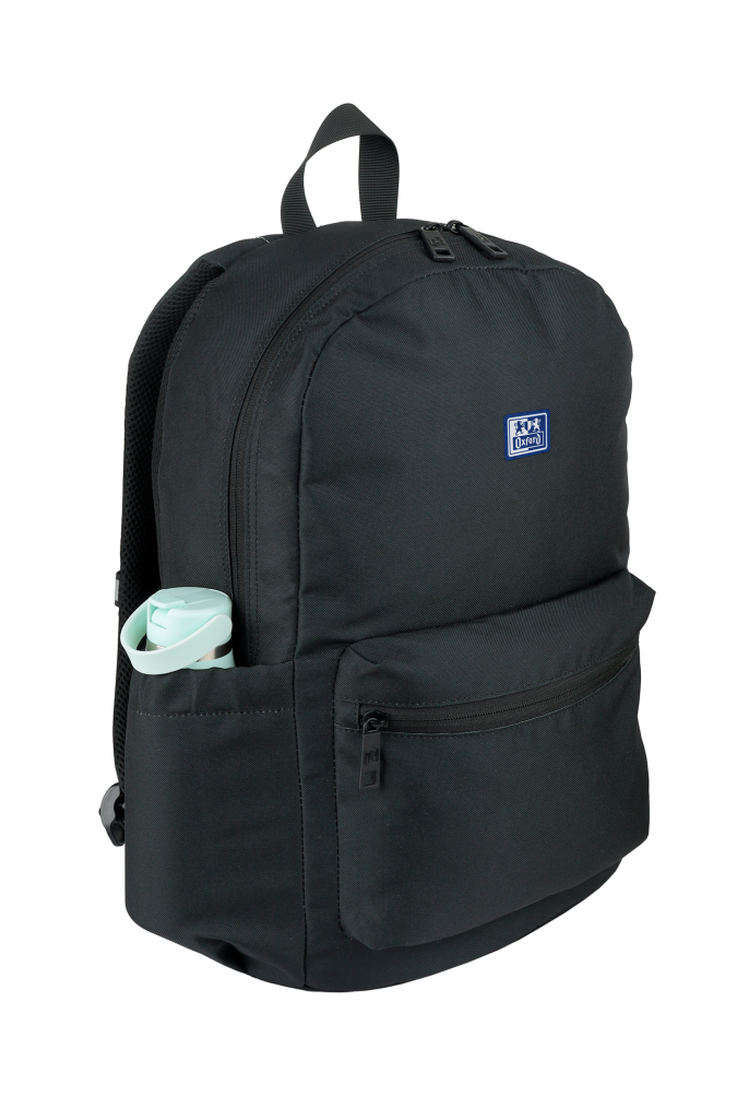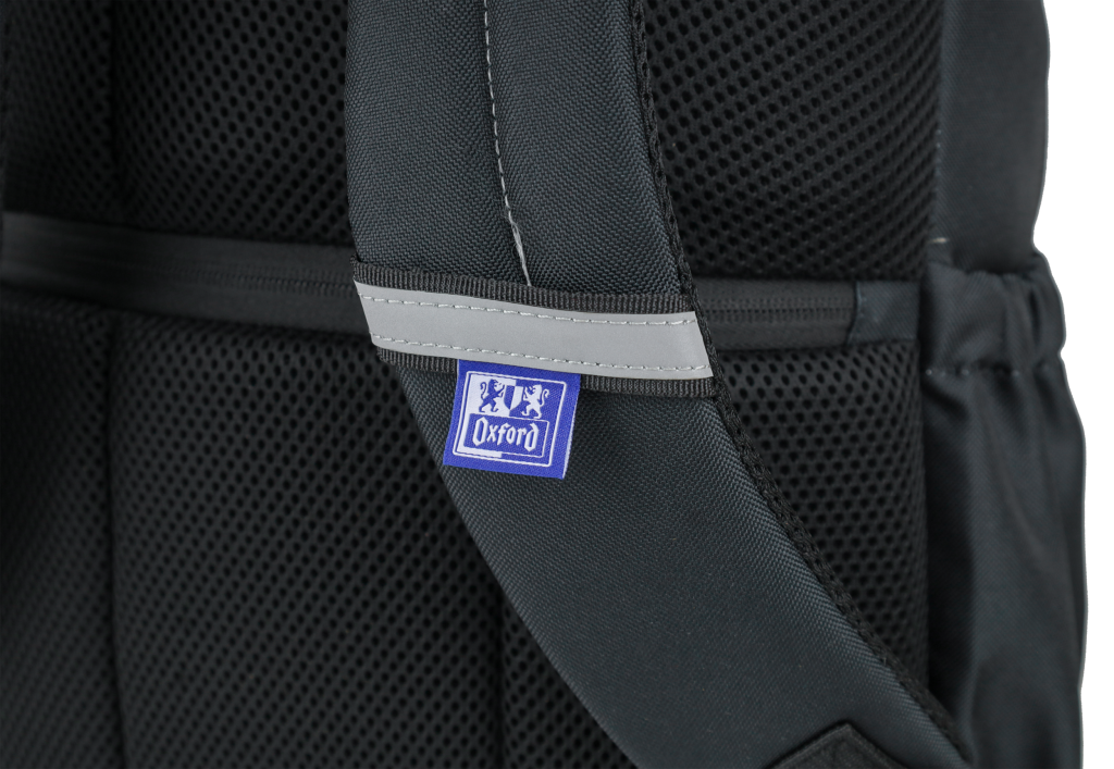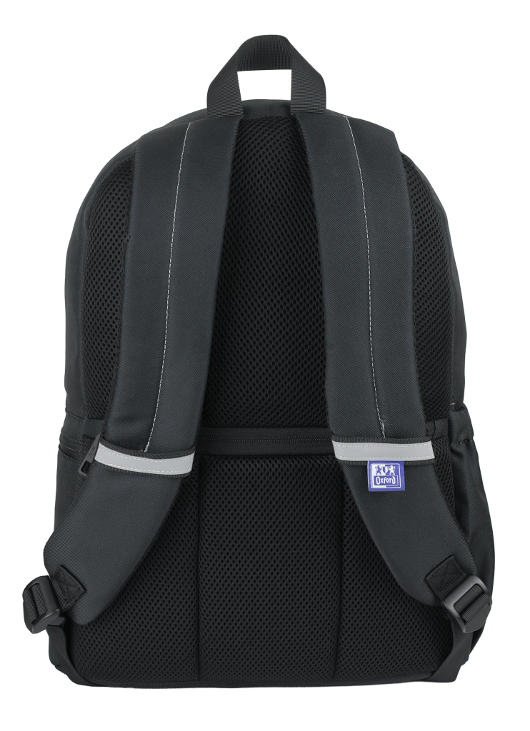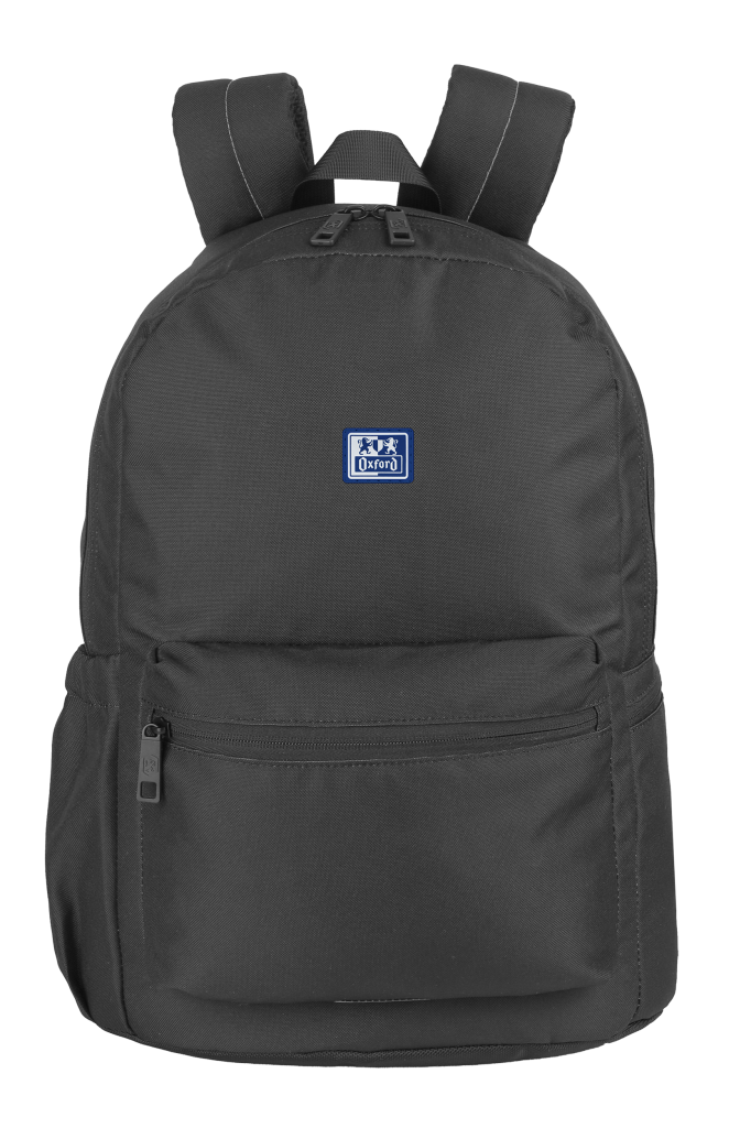 Batoh školní Oxford černý velká hlavní přihrádka a vyztužená kapsa na notebook, menší kapsa vpředu a dvě boční. Zpevněné dno batohu. Vyztužená, prošívaná záda, nastavitelné ramenní popruhy. Polyester, 42 x 29 x 17 cm, 18 l