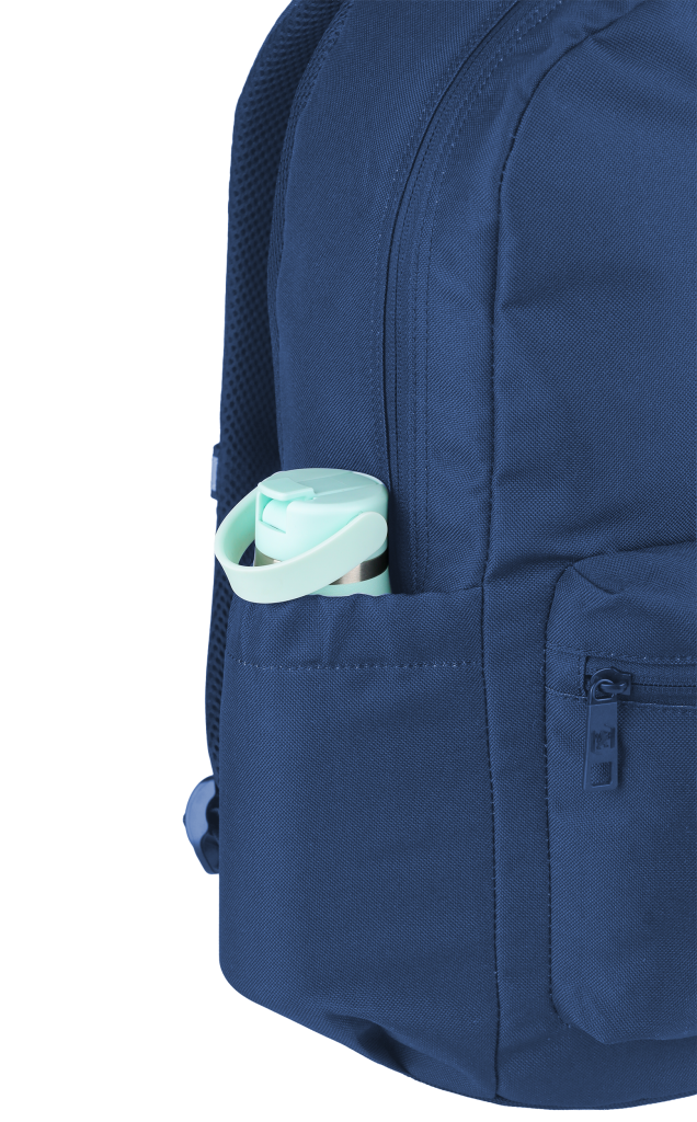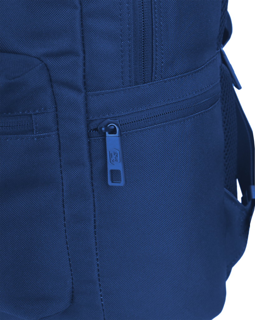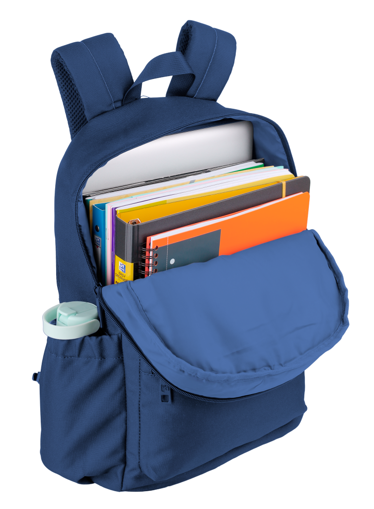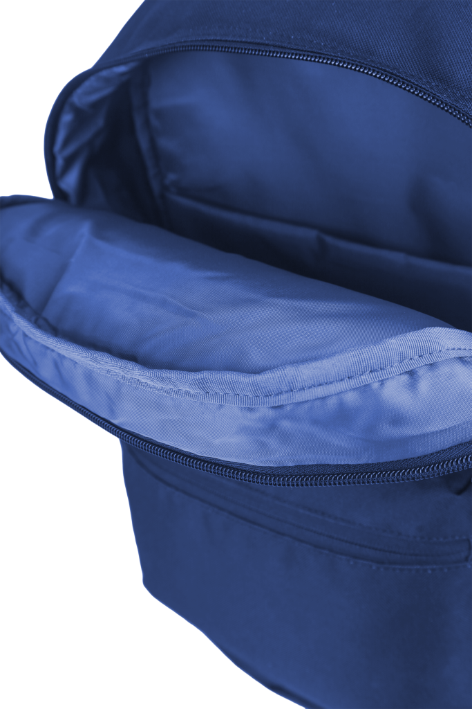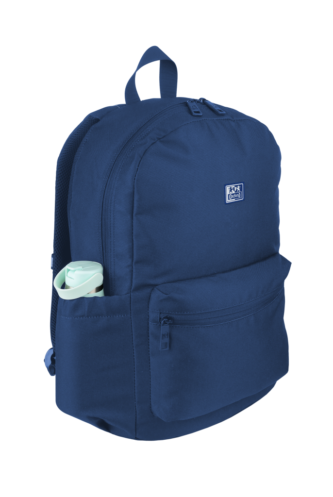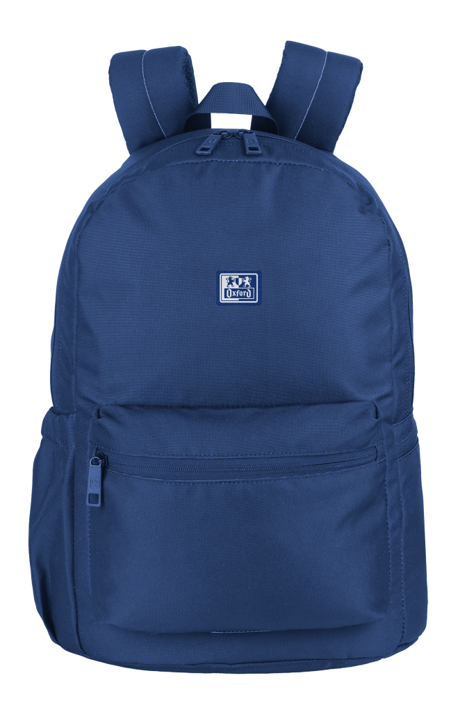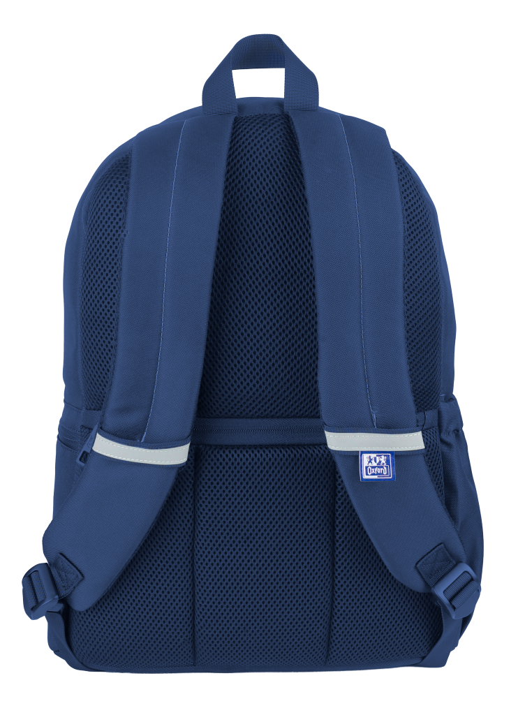 Batoh školní Oxford modrý velká hlavní přihrádka a vyztužená kapsa na notebook, menší kapsa vpředu a dvě boční. Zpevněné dno batohu. Vyztužená, prošívaná záda, nastavitelné ramenní popruhy. Polyester, 42 x 29 x 17 cm, 18 l