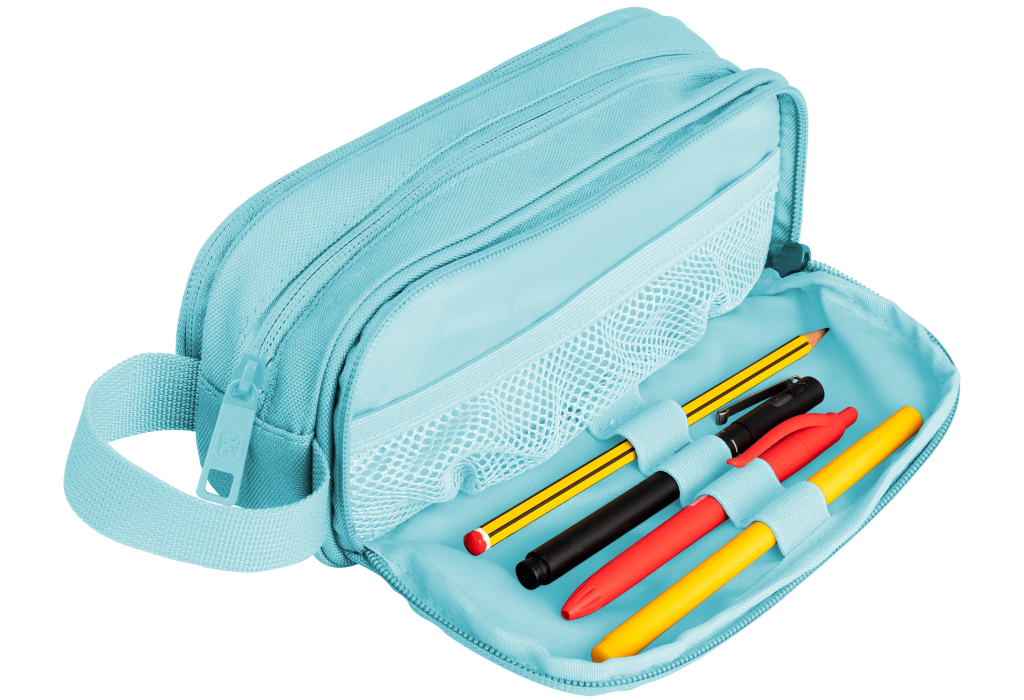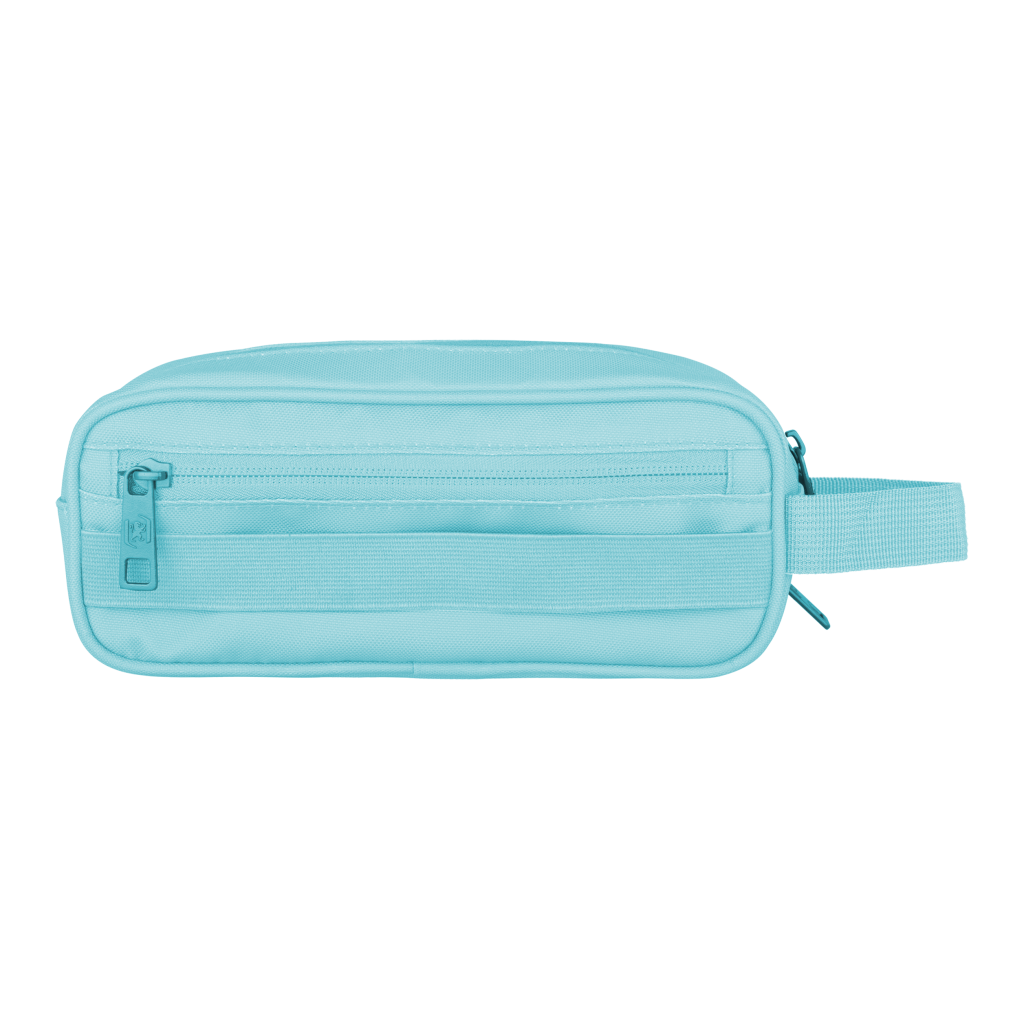 polyester, 22 x 9,5 x 7 cm, 2 uzavíratelné kapsy na zip. Zip splným otevíráním. Vnitřní podšívka z textilní tkaniny sladěné s barvou penálu. Rukojeť pro snadnou přepravu. Recyklovaný materiál RPET.