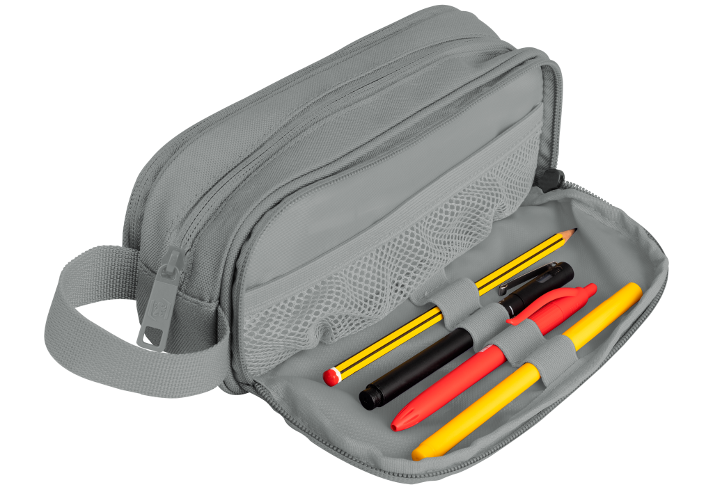 polyester, 22 x 9,5 x 7 cm, 2 uzavíratelné kapsy na zip. Zip s plným otevíráním. Vnitřní podšívka z textilní tkaniny sladěné s barvou penálu. Rukojeť pro snadnou přepravu. Recyklovaný materiál RPET.