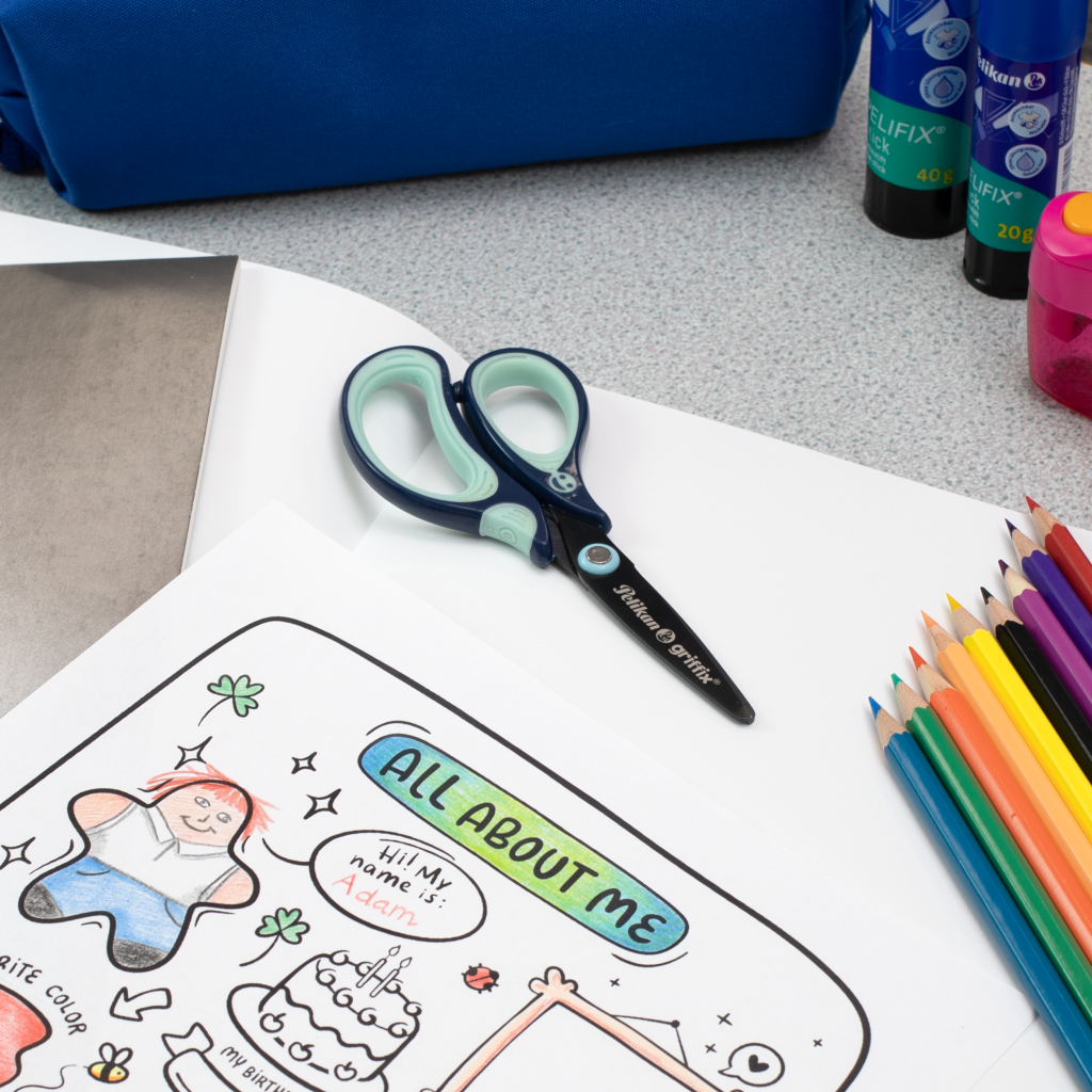 Rodiče i učitelé chtějí mít ve škole kvalitní nůžky, které jsou odolné a pevné. Velmi důležitá je také ergonomie a snadná manipulace pro děti. Uvedením školních nůžek Griffix® přinesla společnost Pelikan na trh vysoce kvalitní výrobek, který všechny tyto vlastnosti spojuje. Nůžky jsou přizpůsobeny pro použití ve výuce a zároveň cíleně podporují rozvoj jemné motoriky dětí. Moderní barevné kombinace dokonale ladí s plnicími pery Griffix. Zesílené čepele jsou mimořádně odolné proti nárazům a poškrábání – díky povrchové úpravě nitridem titanu jsou až 3× tvrdší než ocel. Model určený pro praváky.