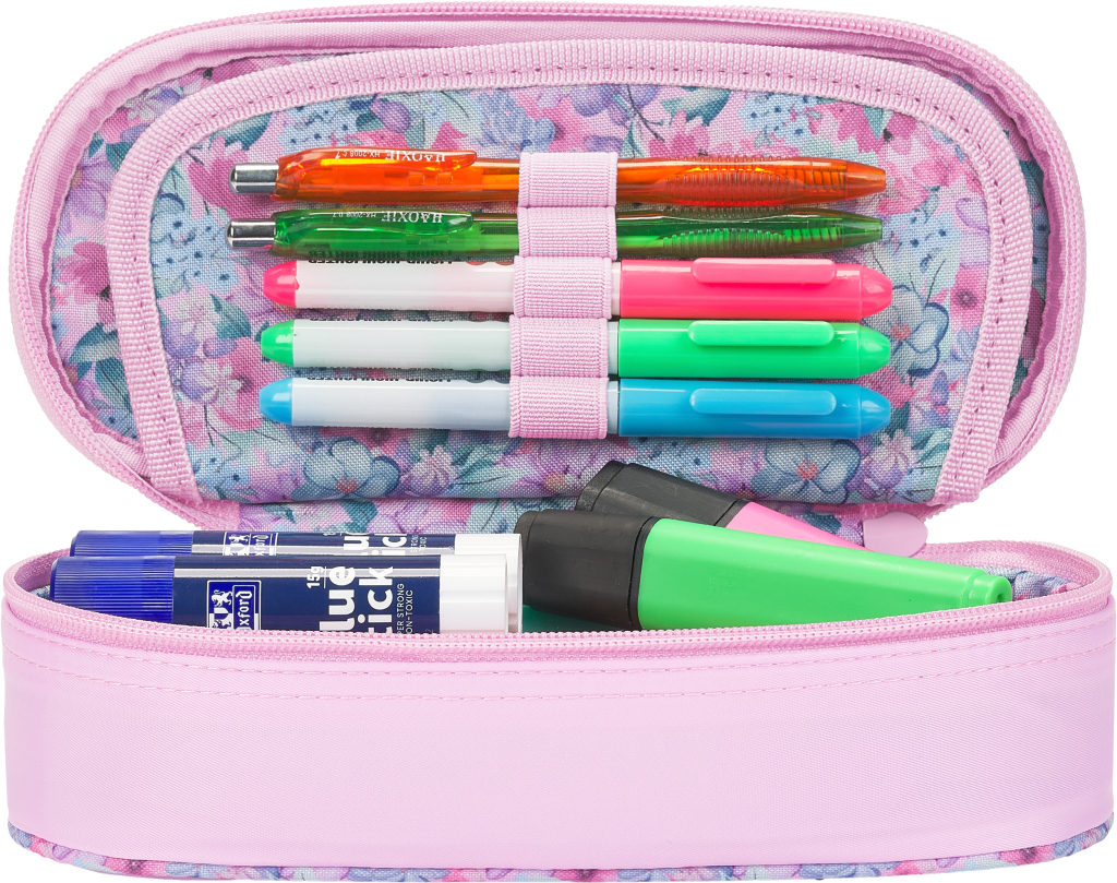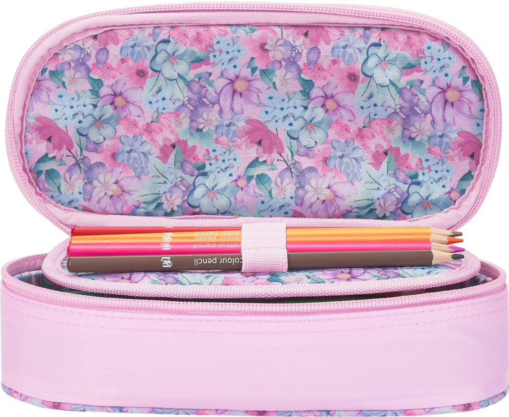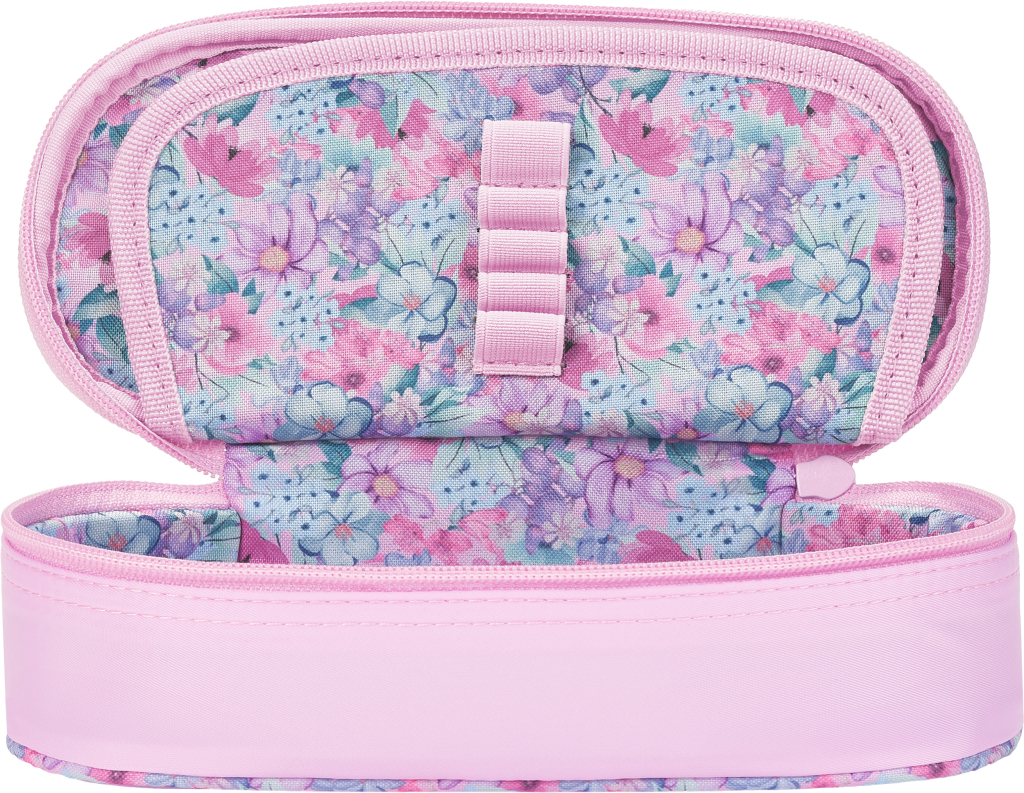Voděodolná polyesterová tkanina, květinová podšívka uvnitř pouzdra. Klopa s integrovanou kapsou a poutky na pero. Hlavní kapsa na zip. 23,5 x 8,5 x 5 cm