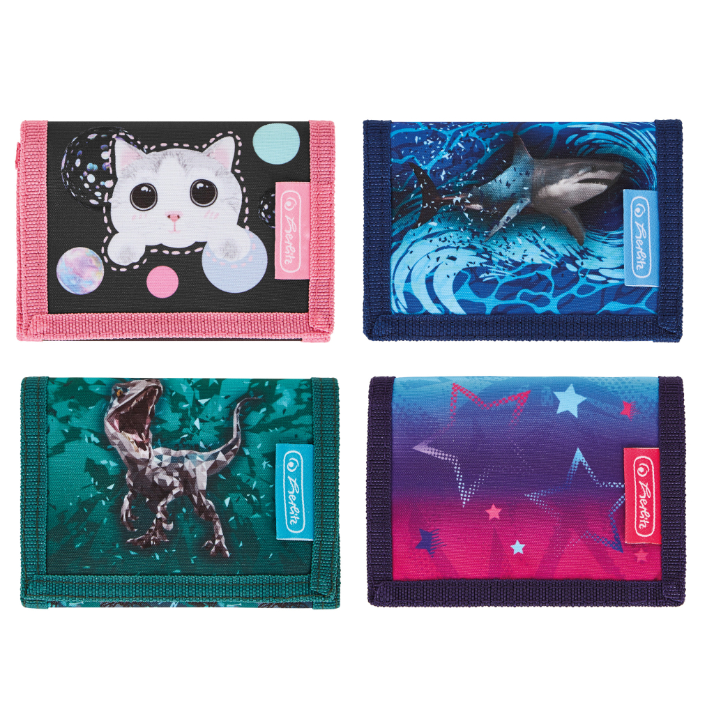 11,5 x 8 x 2 cm, kroužek na klíče, zapínání na suchý zip, kapsička na mince, materiál: polyester, mix motivů: černá, modrá, zelená, fialová