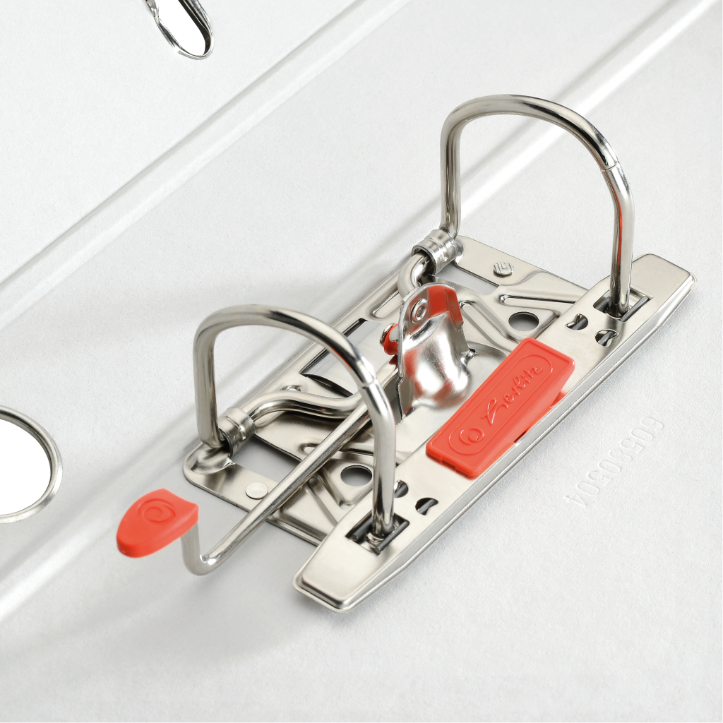 vnitřní polep v barvě pořadače, PP, hřbetní štítek, celobarevný, páková mechanika, prstokroužek, radokroužek, kapacita 570 listů
