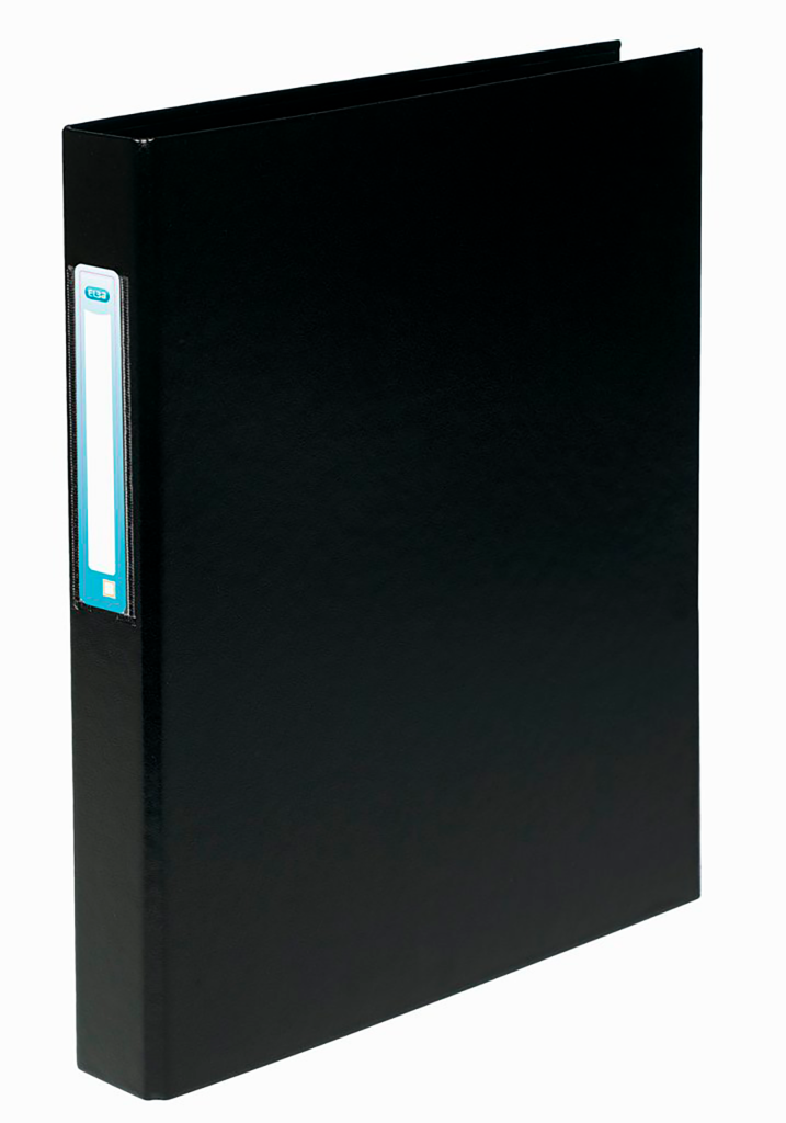 na výšku, 4-kroužkový, mechanika typu D 30 mm ( hřbet 50 mm), vyrobený z recyklovaného kartonu potaženého vrstvou odolného PVC, vyměnitelný hřbetní štítek. Černý