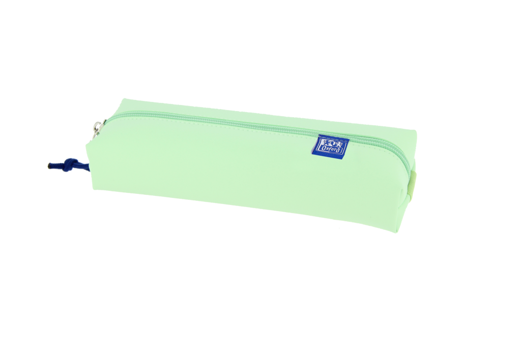 mintové, 1 hlavní přihrádka, 22 x 7 x 3,5 cm. Polstrovaný PVC materiál. Kovové zapínání s modrou stuhou. Barva zipu odpovídá penálu. Vyšívané logo Oxford.