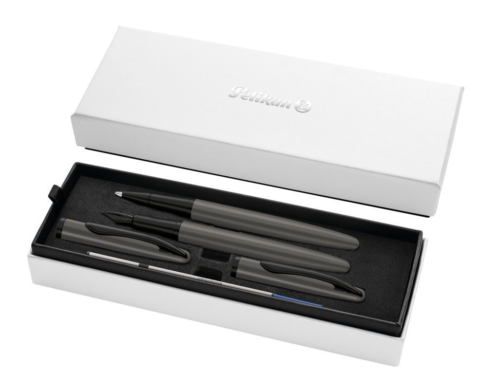 Typická spona ve tvaru zobáku Pelikan je odpružená, a proto obzvláště robustní. Plynulé zásobování inkoustem je zajištěno náplněmi. Hrot M. V boxu.