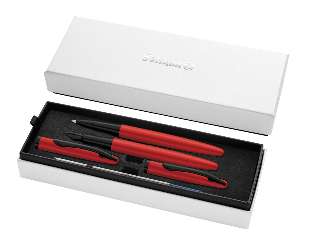 typická spona ve tvaru zobáku Pelikan je odpružená, a proto obzvláště robustní. Plynulé zásobování inkoustem je zajištěno náplněmi. Hrot M. V boxu.