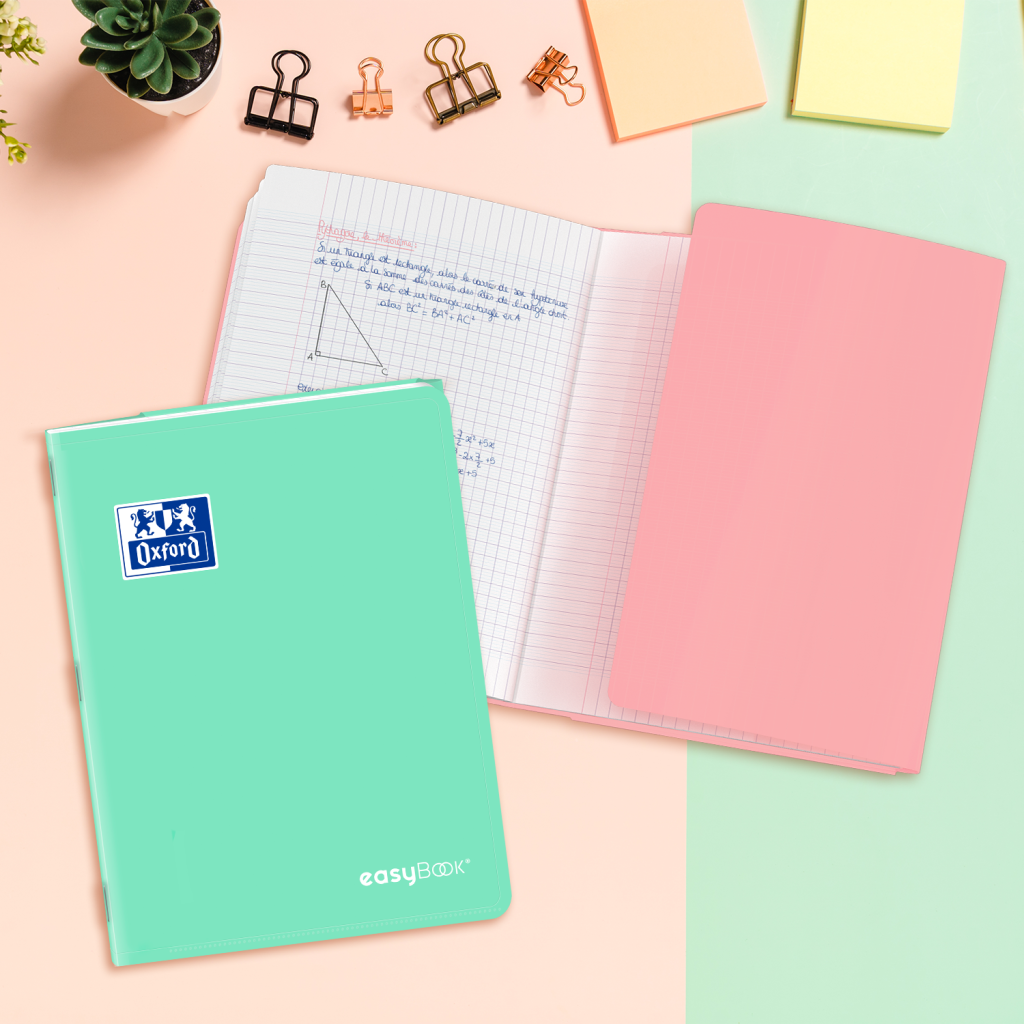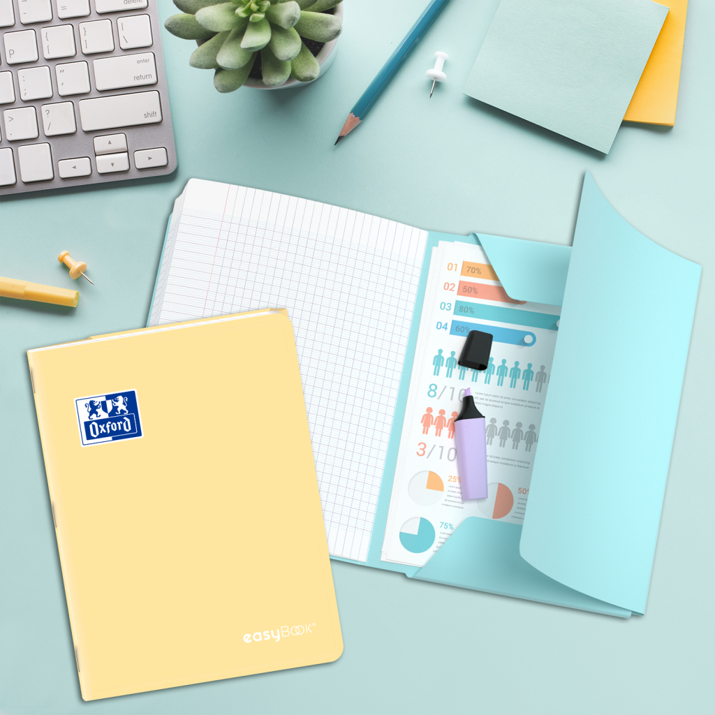 Sešit A5/60 linka, mix pastel PP desky s hladkým povrchemy s logem značky Oxford. Vepředu sešitu kapsa na volné listy a na konci sešitu je složka na dokumenty, jejít klopa slouží i jako záložka, Optik Paper.