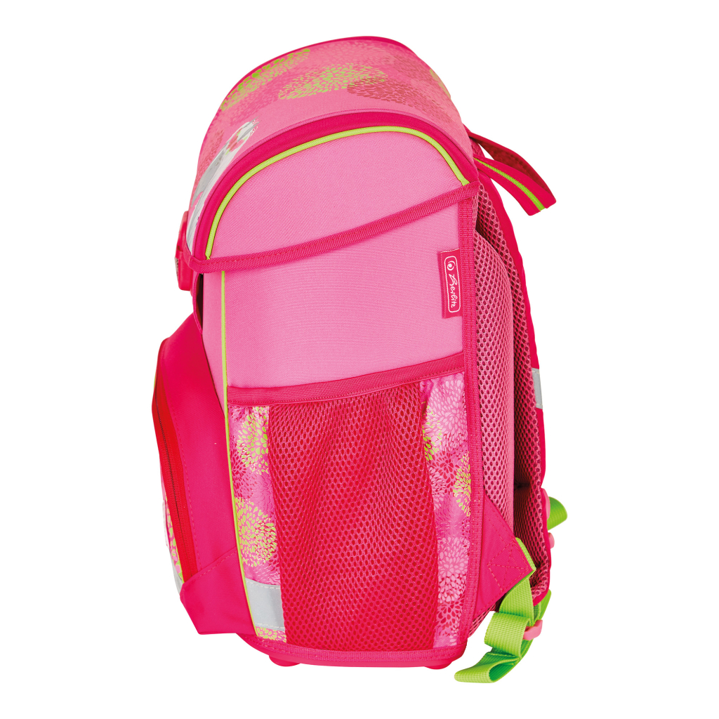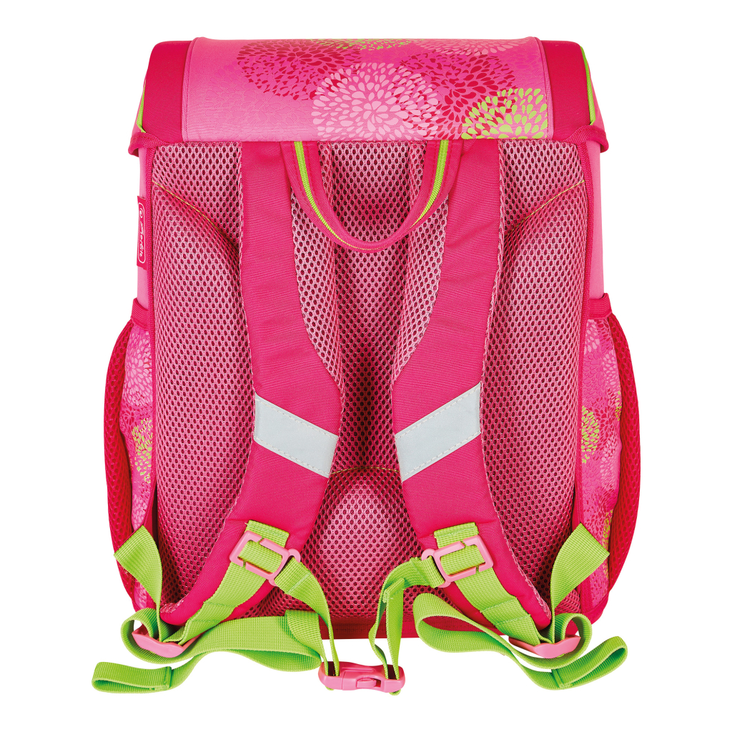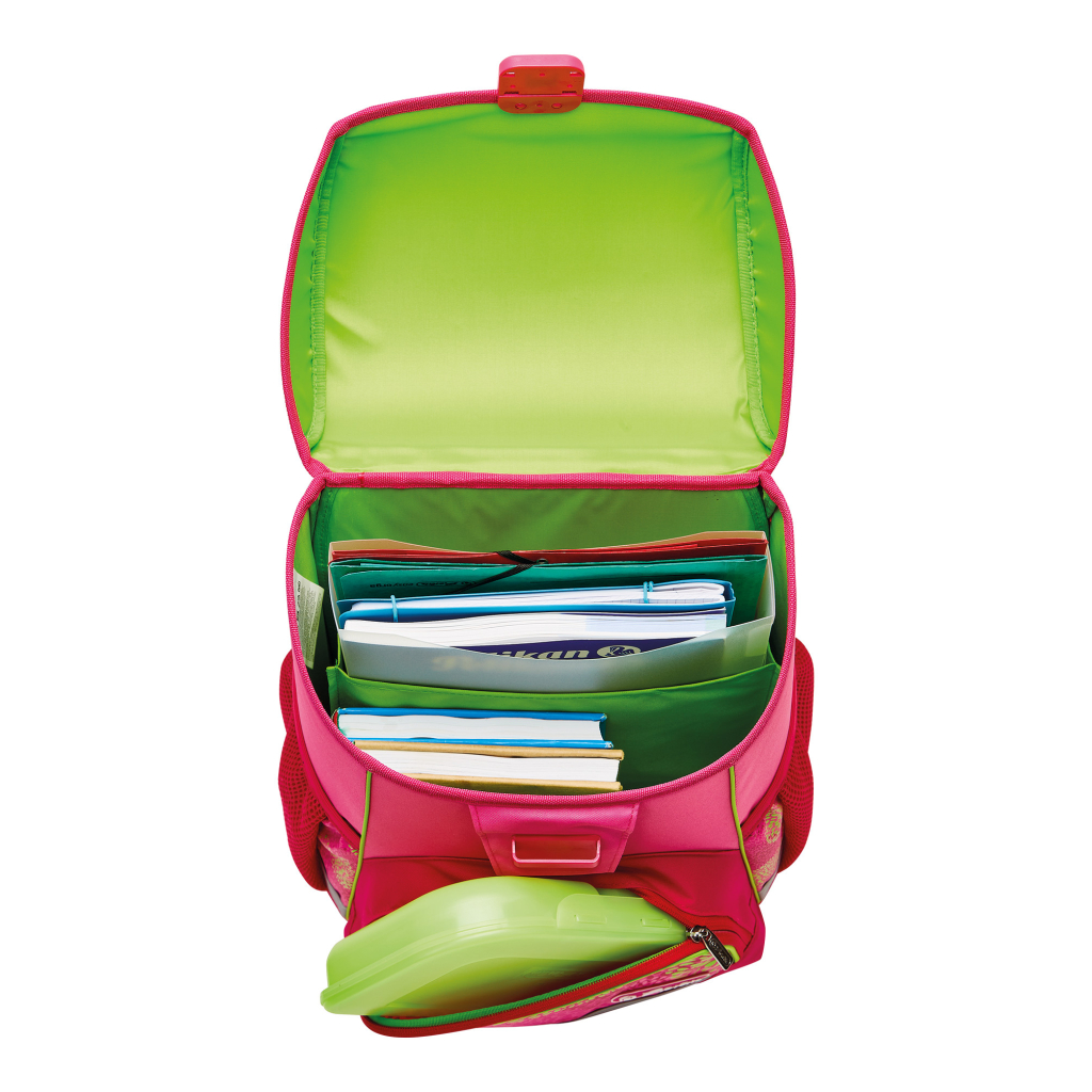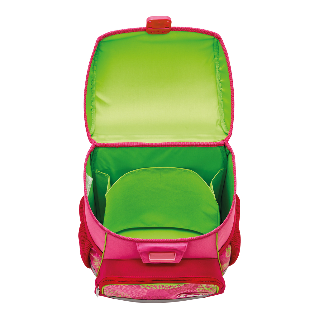 36 x 28 x 21 cm, anatomicky tvarovaná polstrovaná prodyšná záda, široké nastavitelné ramenní popruhy, hrudní popruh, přední kapsa na zip, dvě boční kapsy s elastickými pásky, zámek reflexní pruhy Oralite, stabilní spodní deska s nožičkami, zavírání Click lock s odrazkou, hmotnost 950 g, Objem: 15l, voděodolná, bez PVC, výbava: penál 16 dílů: 6 fix, 6 pastelek, tužka, ořezávátko, guma, pravítko, sáček na cvičky, kulaté pouzdro