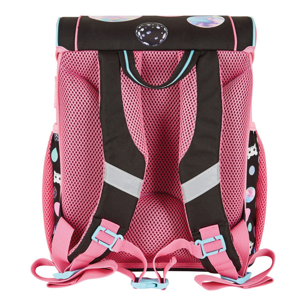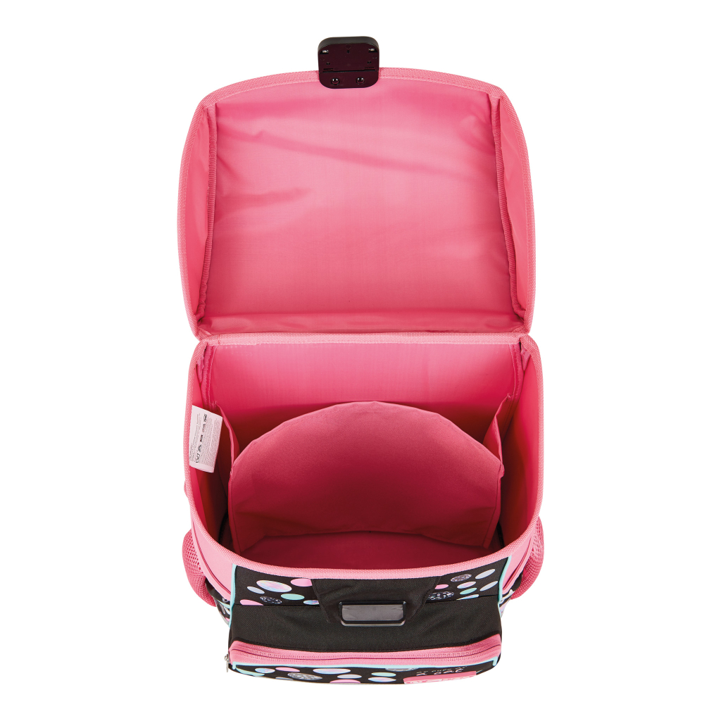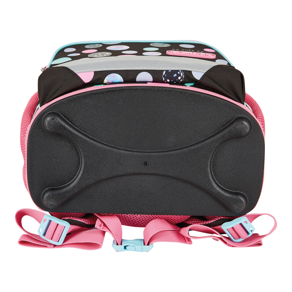 37 x 31 x 22 cm, ergonomicky tvarované a prodyšné polstrování zad, nastavitelné ramenní popruhy, výškově nastavitelný hrudní pás, hlavní kapsa s prostorem pro knihy, boční kapsy s elastickými pásky, přední kapsa na zip, stabilní spodní deska s nožičkami, pohodlná rukojeť, zavírání Click lock s odrazkou, reflexní materiály Oralite, Hmotnost 950 g, objem 15 l, voděodolná, bez PVC, Výbava: penál 16 dílů: 6 fix, 6 pastelek s certifikací FSC, tužka, pravítko, guma, ořezávátko, sáček na cvičky, kulaté pouzdro