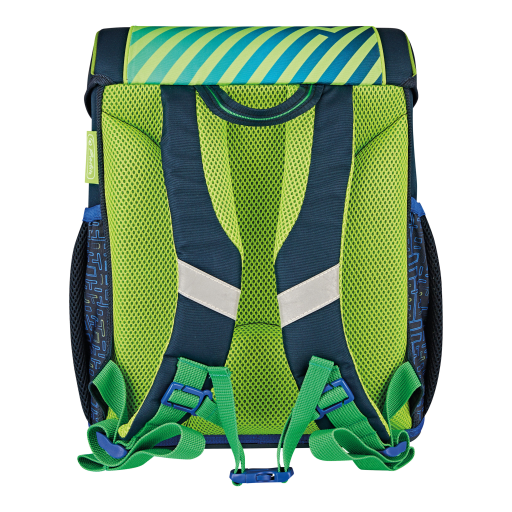 37 x 31 x 22 cm, ergonomicky tvarované a prodyšné polstrování zad, nastavitelné ramenní popruhy, výškově nastavitelný hrudní pás, hlavní kapsa s prostorem pro knihy, boční kapsy s elastickými pásky, přední kapsa na zip, stabilní spodní deska s nožičkami, pohodlná rukojeť, zavírání Click lock s odrazkou, reflexní materiály Oralite. Hmotnost 950 g, objem 15 l, voděodolná Výbava: penál 16 dílů: 6 fix, 6 pastelek s certifikací FSC, tužka, pravítko, guma, ořezávátko, sáček na cvičky, kulaté pouzdro