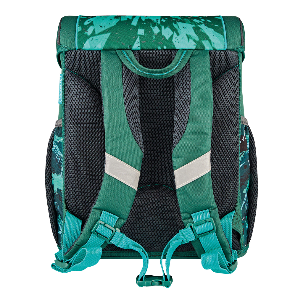 37 x 31 x 22 cm, ergonomicky tvarované a prodyšné polstrování zad, nastavitelné ramenní popruhy, výškově nastavitelný hrudní pás, hlavní kapsa s prostorem pro knihy, boční kapsy s elastickými pásky, přední kapsa na zip, stabilní spodní deska s nožičkami, pohodlná rukojeť, zavírání Click lock s odrazkou, reflexní materiály Oralite. Hmotnost 950 g, objem 15 l, voděodolná Výbava: penál 16 dílů: 6 fix, 6 pastelek s certifikací FSC, tužka, pravítko, guma, ořezávátko, sáček na cvičky, kulaté pouzdro